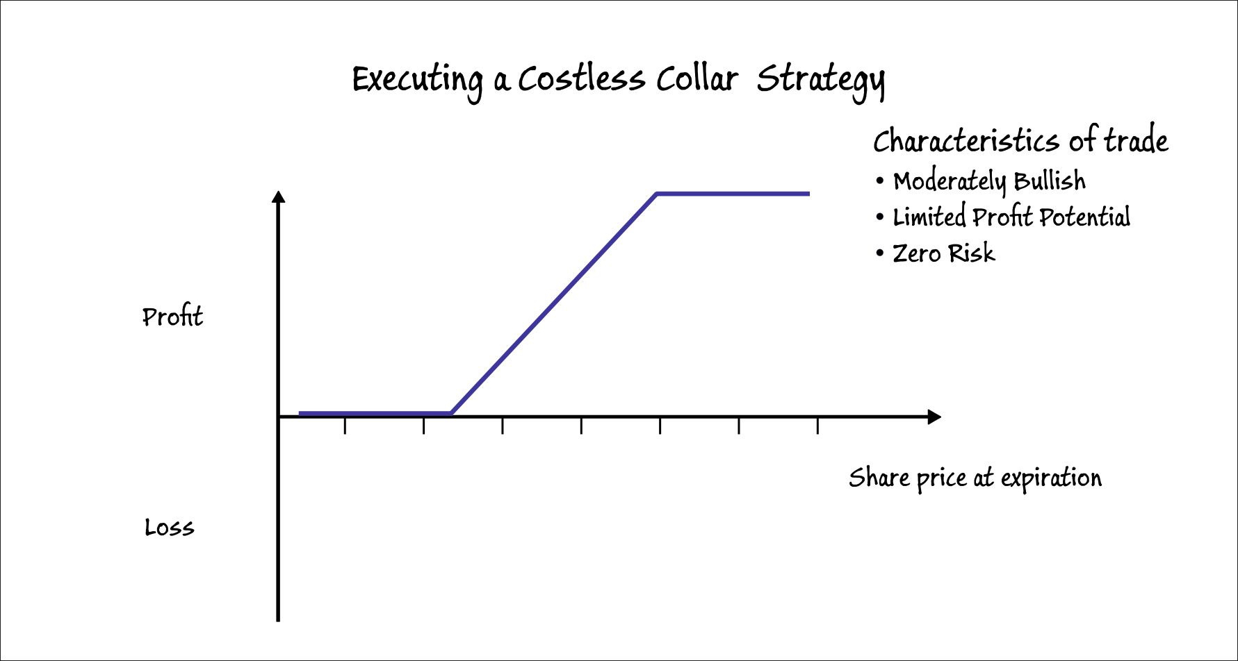 The rationale for establishing a costless collar is to protect the stock holdings from a significant decline in prices and still partake in a slight to moderate increase in the stock price if any. At this point, an options trader should be convinced that there is a potential for a small profit.