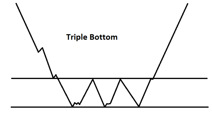 A triple bottom is a scenario where the price of a security reaches a low thrice before rising up. Each low is maybe at or higher than the previous low. The price of the security is unable to make a lower low. It also eventually breaks above the most recent significant peak and moves upwards from then.