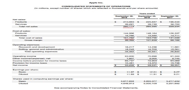 The net earnings can be found on the line “net income” in Apple Inc’s annual report or 10K as you can see above here. It can be found just above the earnings per share figures.
